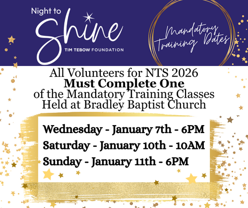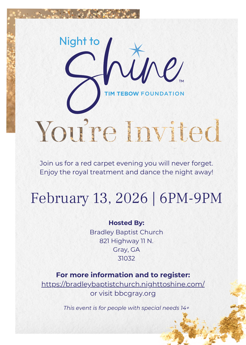 This coming year, on Friday, February 13, 2026, Night to Shine will celebrate its tenth anniversary as hundreds of churches and volunteers come together to honor thousands of guests with special needs. Our church is so excited to join other churches around the globe in hosting this unforgettable night!!