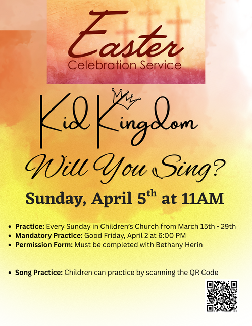 We are so excited for the children of Kid Kingdom to have a special part in our Easter Celebration! Join us Easter Sunday at our 11:00 AM Worship Service as our kids help celebrate the joy and victory of the resurrection. It’s going to be a meaningful and exciting moment you won’t want to miss! Bring your family and come celebrate the greatest story ever told with us this Easter!